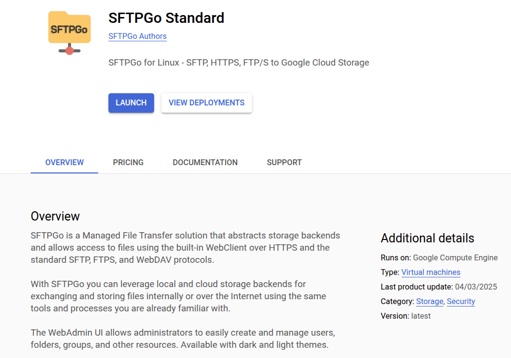 SFTPGo is available on Google Cloud Platform as a virtual machine image. The following editions are available: