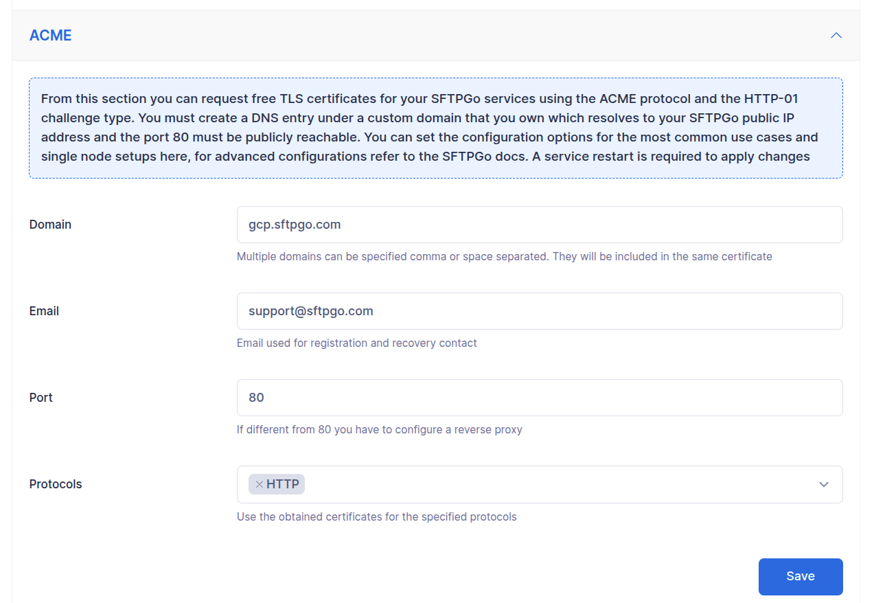 From the SFTPGo WebAdmin UI go to the "Server Manager" section, select "Configurations" and then "ACME".