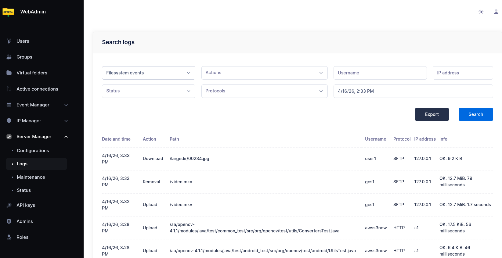 - Filesystem Logs — file transfers (uploads, downloads), directory operations (create, delete, rename), SSH commands, and file copies. Each entry shows the timestamp, username, action, file path, protocol, client IP, and transfer status.