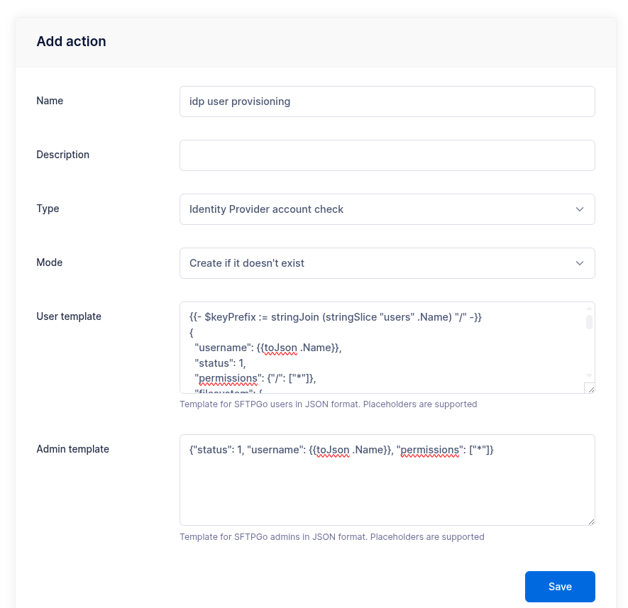 - The Identity Provider account check action creates (or updates) the SFTPGo user based on a template you define.