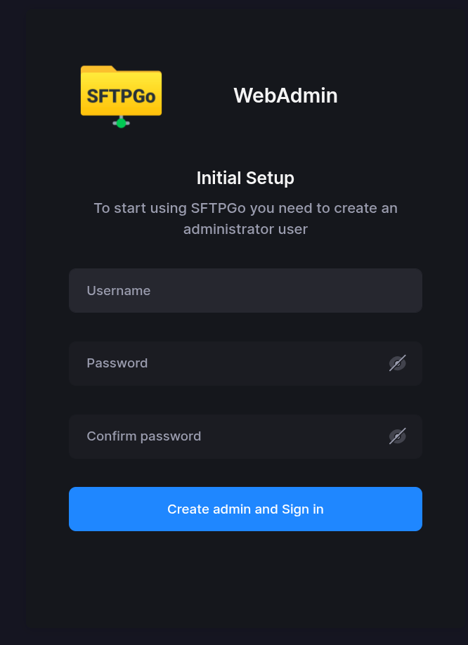 Open http://127.0.0.1:8080/web/admin in your browser (replace 127.0.0.1 with the appropriate address if SFTPGo is not running on localhost).