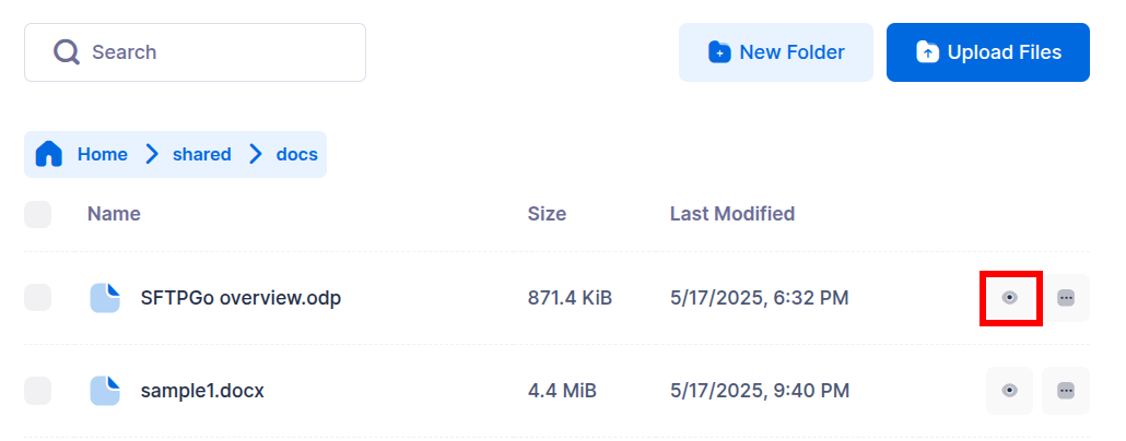 The WebClient allows users to easily manage files and folders within their SFTPGo storage from the "Files" section.