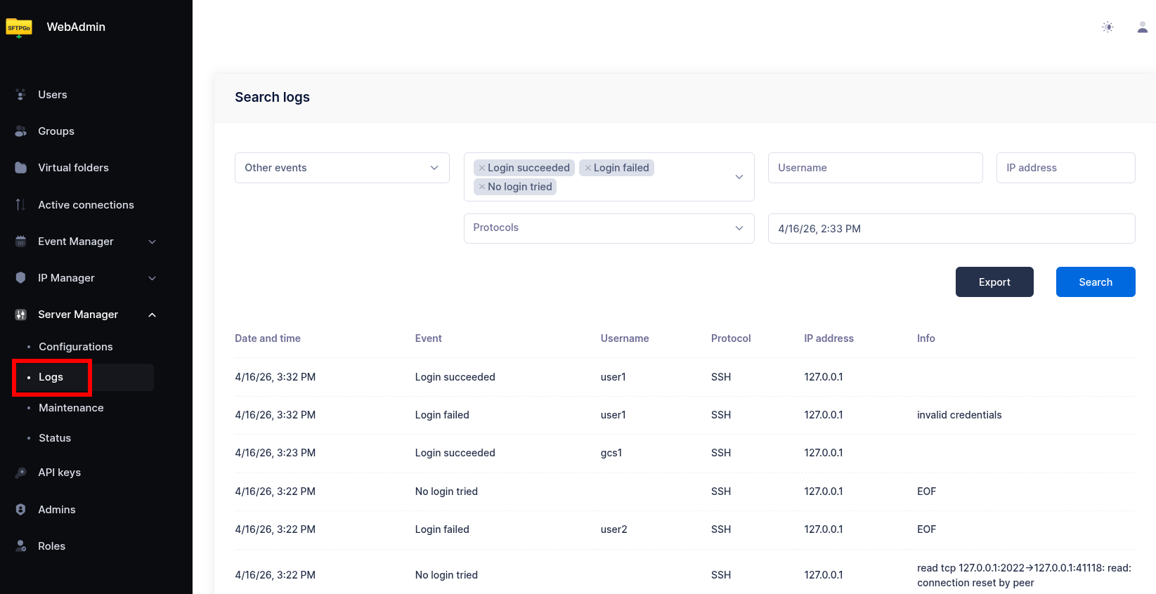 By default, SFTPGo writes logs to the systemd journal or to a file, depending on your configuration.
