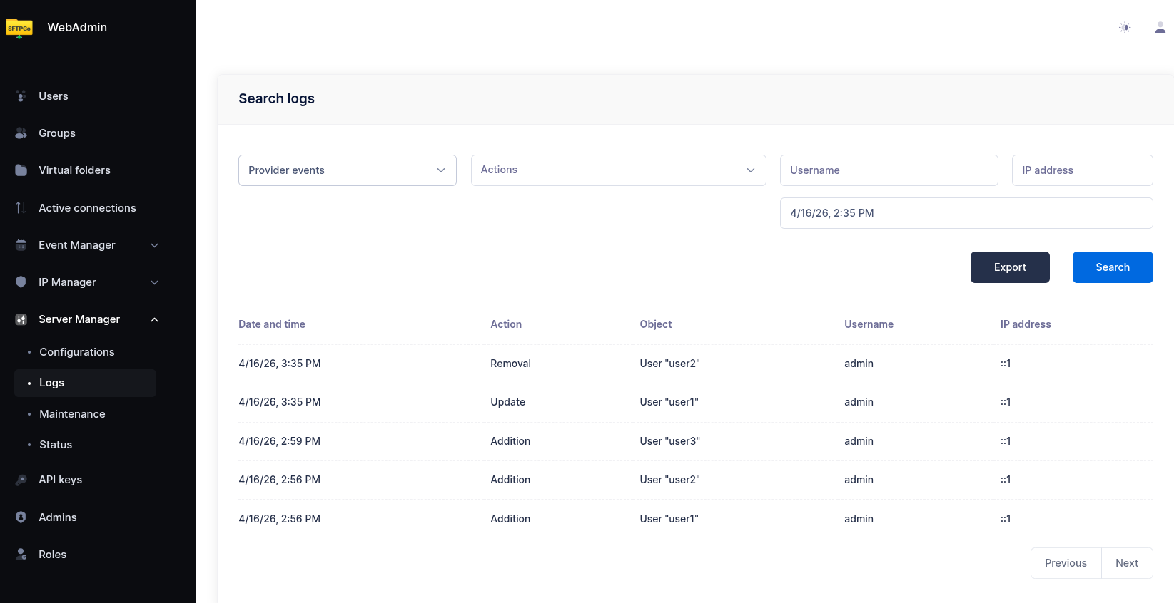 • Provider Logs — administrative changes to SFTPGo objects (users, groups, admins, event rules, etc.). Each entry shows who made the change, what was changed, and when. You can expand an entry to view the full object data.