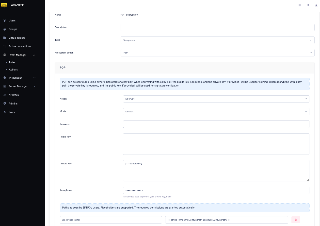 From the WebAdmin, create a new action named PGP decryption, set the type to Filesystem, the Filesystem action to PGP and select the Decrypt option. Paste the Private Key (and optionally the Public Key for signature verification).