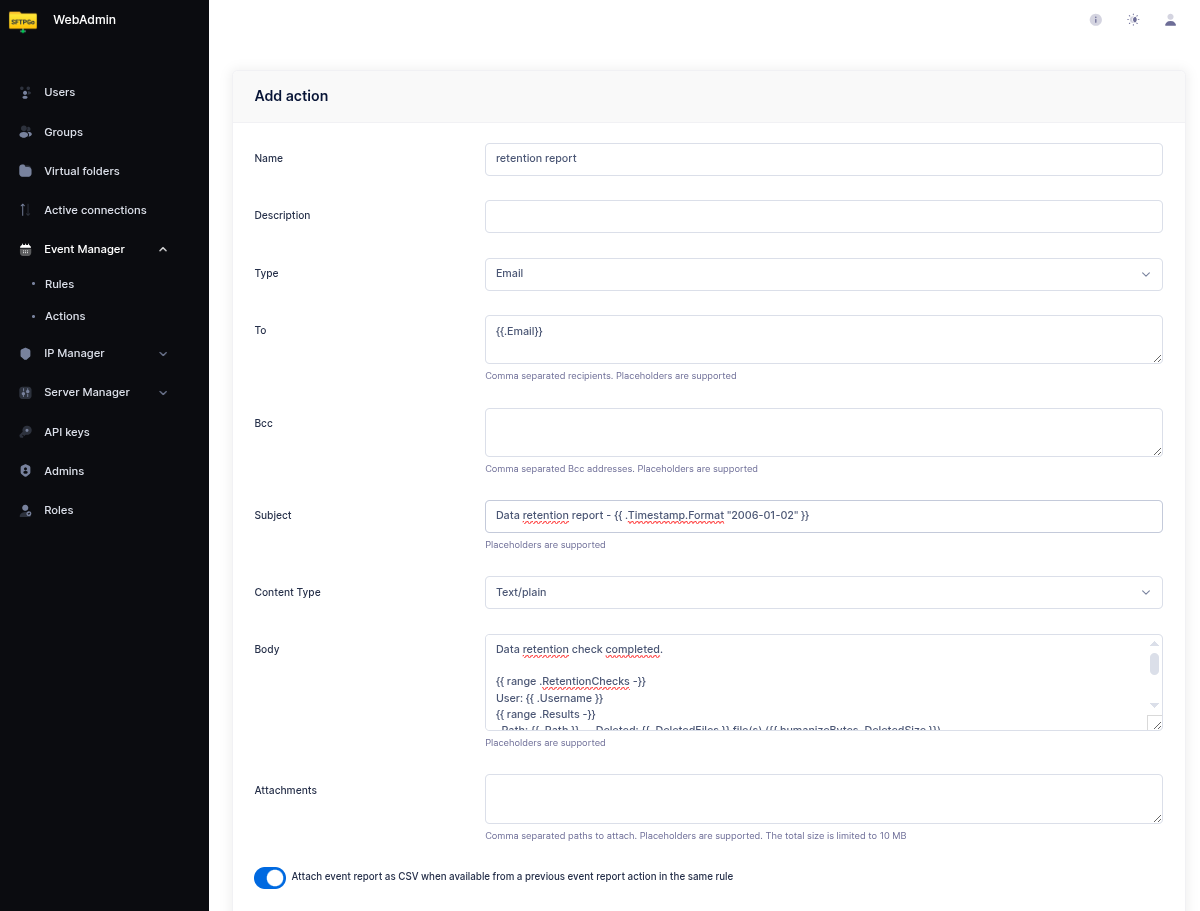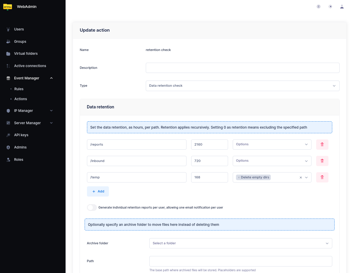 Done! SFTPGo will run the retention check daily and send you a report with the results.