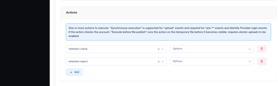 The Data retention check action scans user directories and applies per-folder retention policies. Files older than the configured threshold are automatically removed or moved to an archive folder. The action generates a report that can be sent via email or webhook.