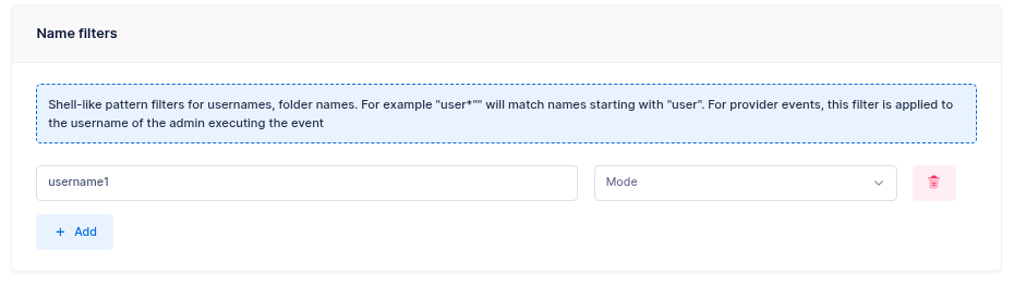 On instances with many users, prefer exact values (usernames, group names, or role names) over wildcard patterns — see Name, group, and role filters for the reason.