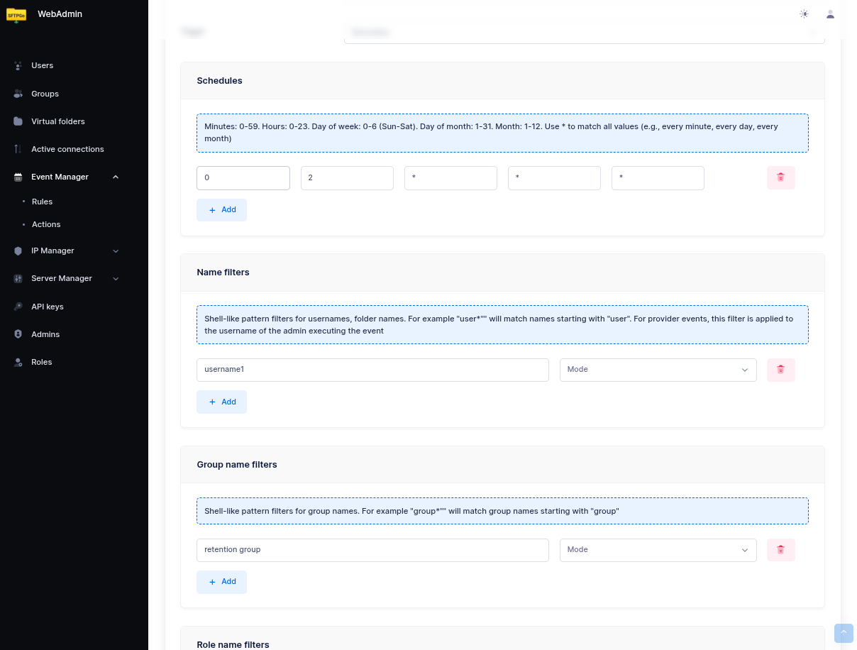 When the same rule needs to apply to many users (e.g., all customers, all vendors), assigning those users to an SFTPGo group and filtering the rule by group is usually cleaner than maintaining a list of usernames or a wildcard pattern: new users inherit the policy automatically as soon as they join the group, and removing a user from the group takes them out of the rule with no rule edit.