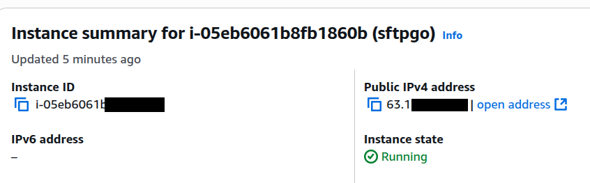 Before you can use SFTPGo you need to create an admin account, so open http://your_instance_IP:8080/web/admin in your web browser, replacing your_instance_IP with the IP address of your instance, which you can find in the AWS Console. The Instance ID is required to validate your installation.